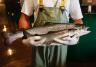 The genetically engineered AquaBounty salmon shown here is about twice the size of its wild kin, although both are roughly the same age.